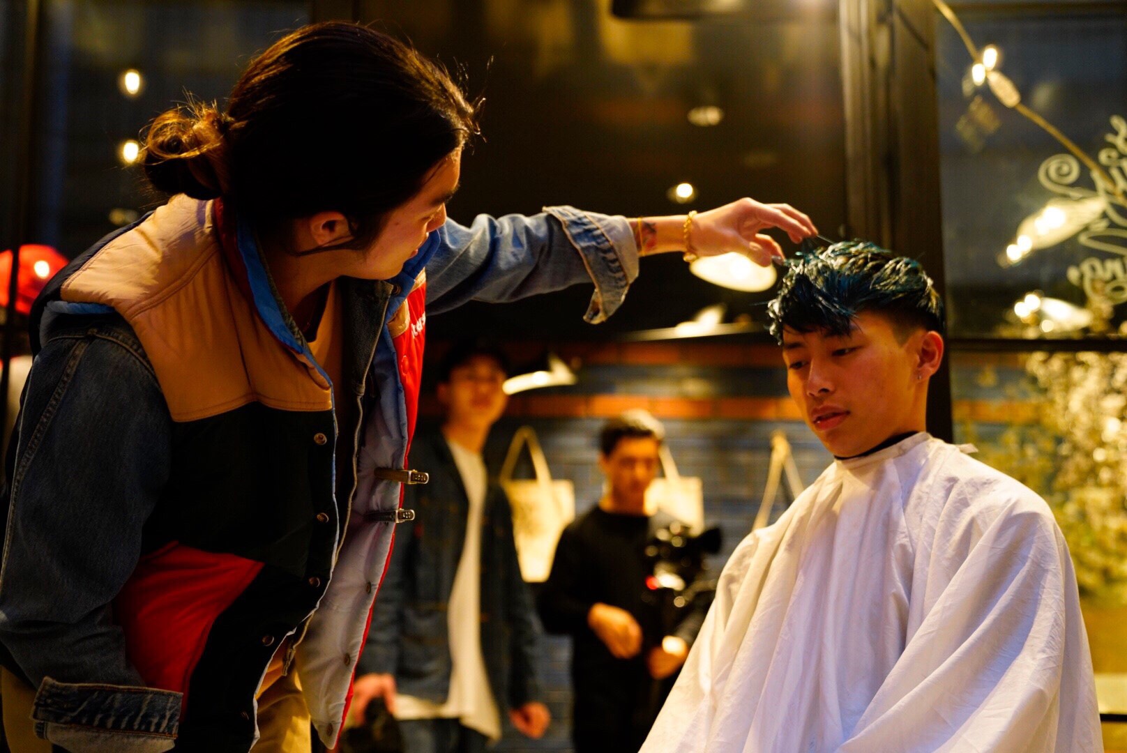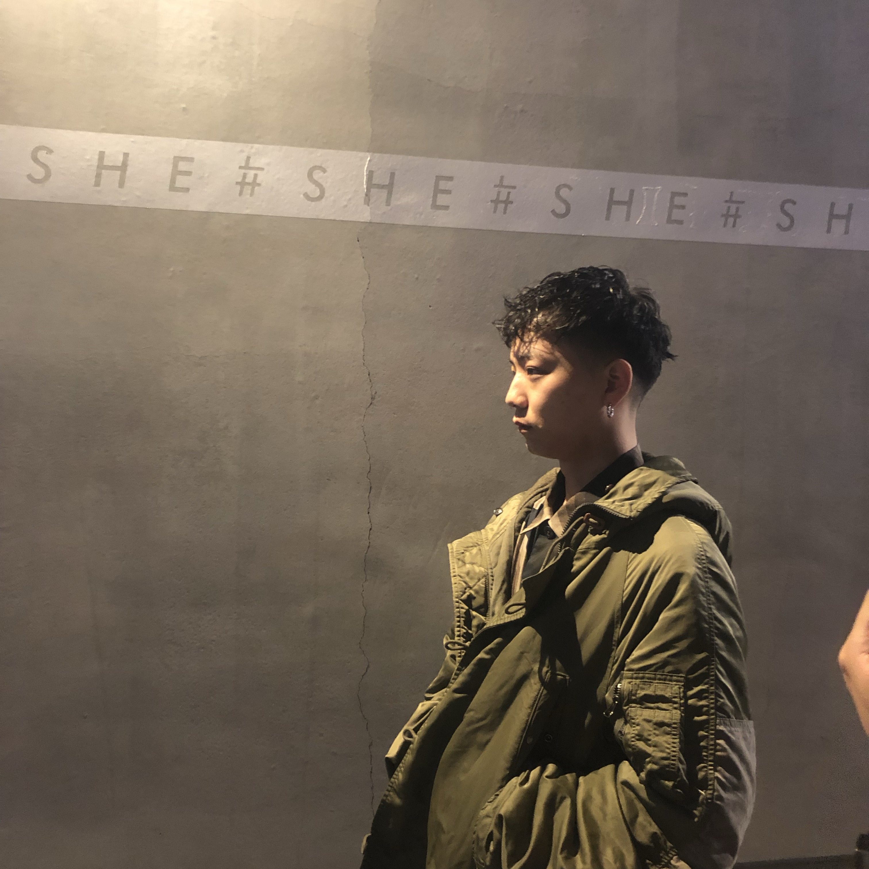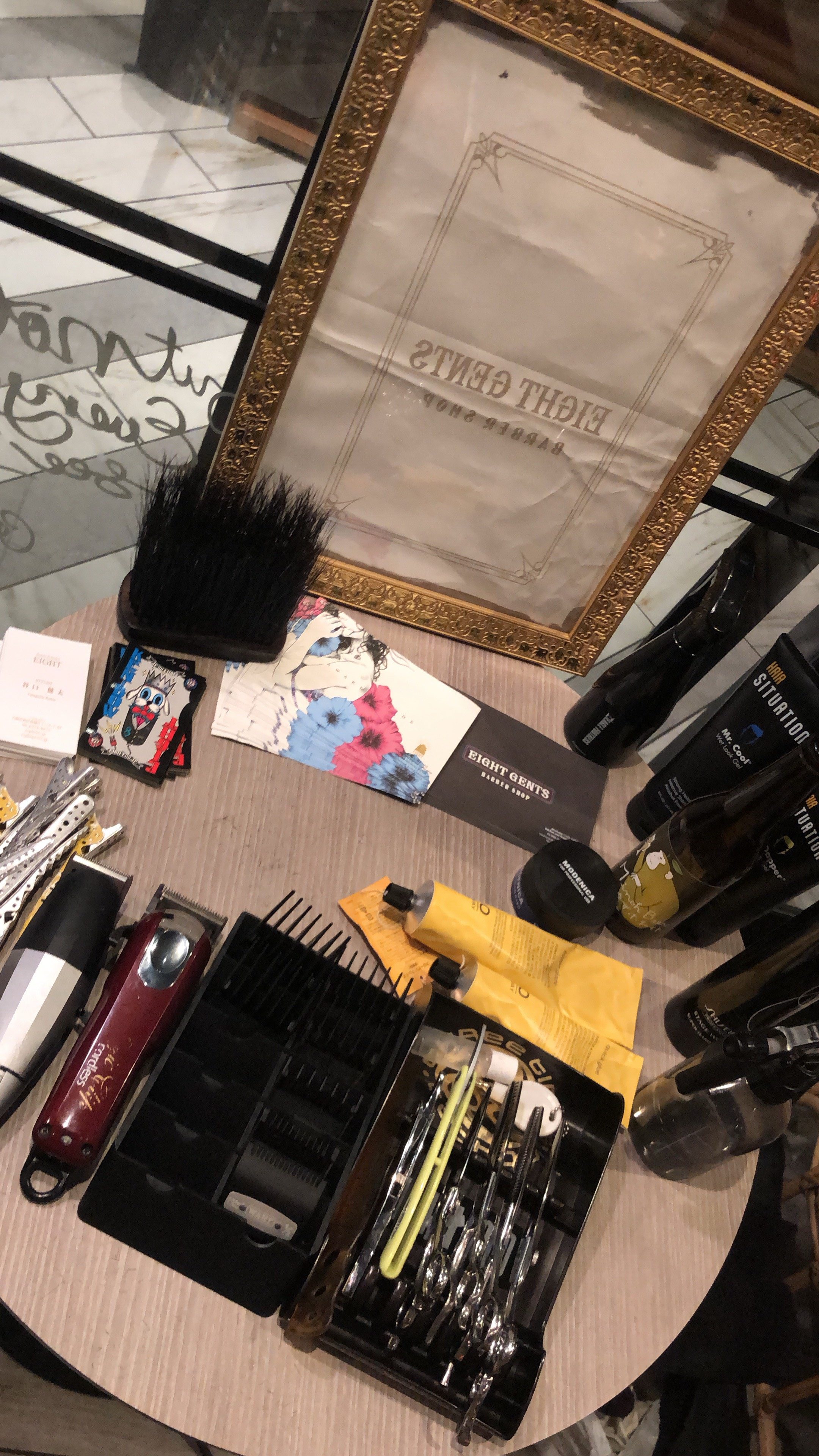 カットブースはいつもの最低限の必要な道具を揃えて額の中はエイトのティシャツを作るときに使ったシルクスクリーンの使い終わったフィルムを額に入れて飾りました。それでイスを用意してテラスの空の下でモデルをカットさせて頂きました!楽しかったです!スタイルはサイドはフェードも入れながらトップはスパイラルパーマで巻いたバーバースタイルとパーマの動きのあるスタイルでユニセックスなメンズでも取り入れやすいようなカットをしました。