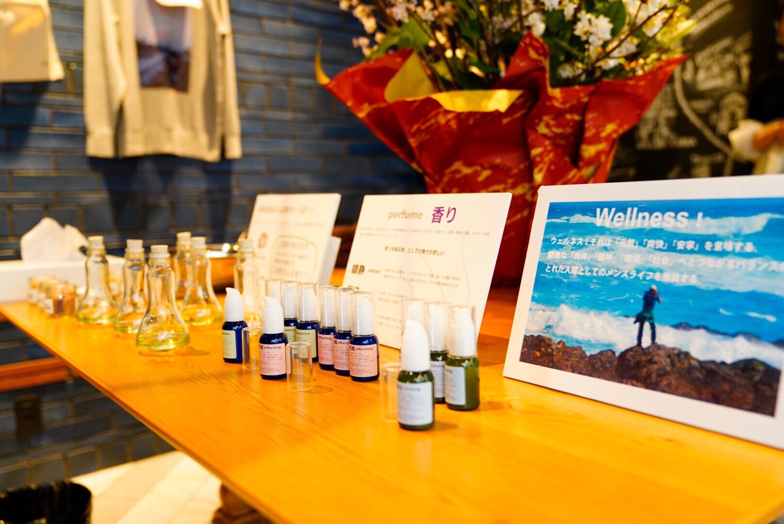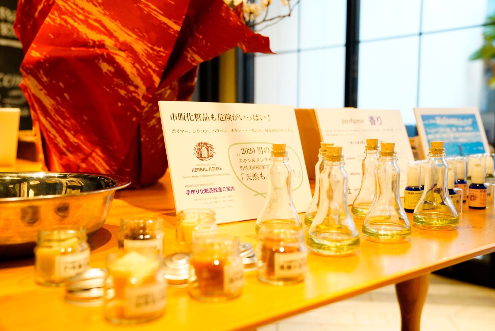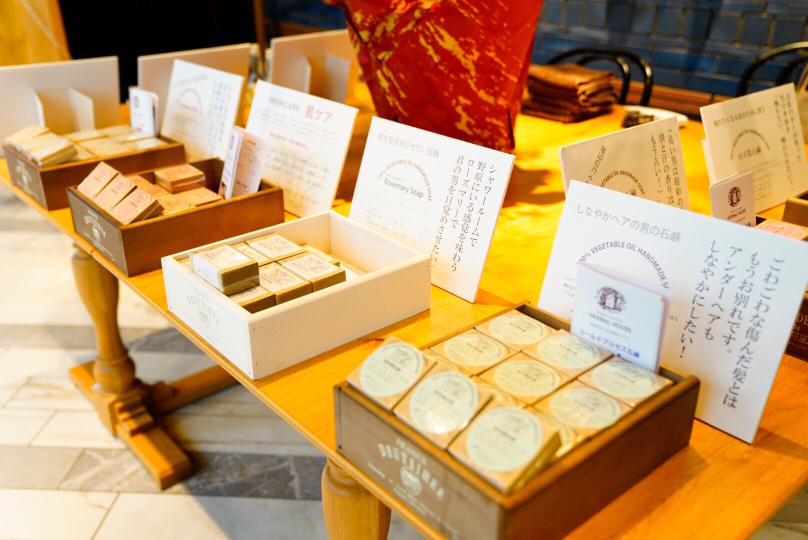 ハーバルの5種類の肌に合わせて選べれる石鹸と練り香水で保湿と香りは「鎮静、促進、強壮」で男性でも美容を使ってもらえるように考え作って頂きました。香りを楽しめる香水サンプルも作って頂いたので来られたお客様が試して楽しんでいました。